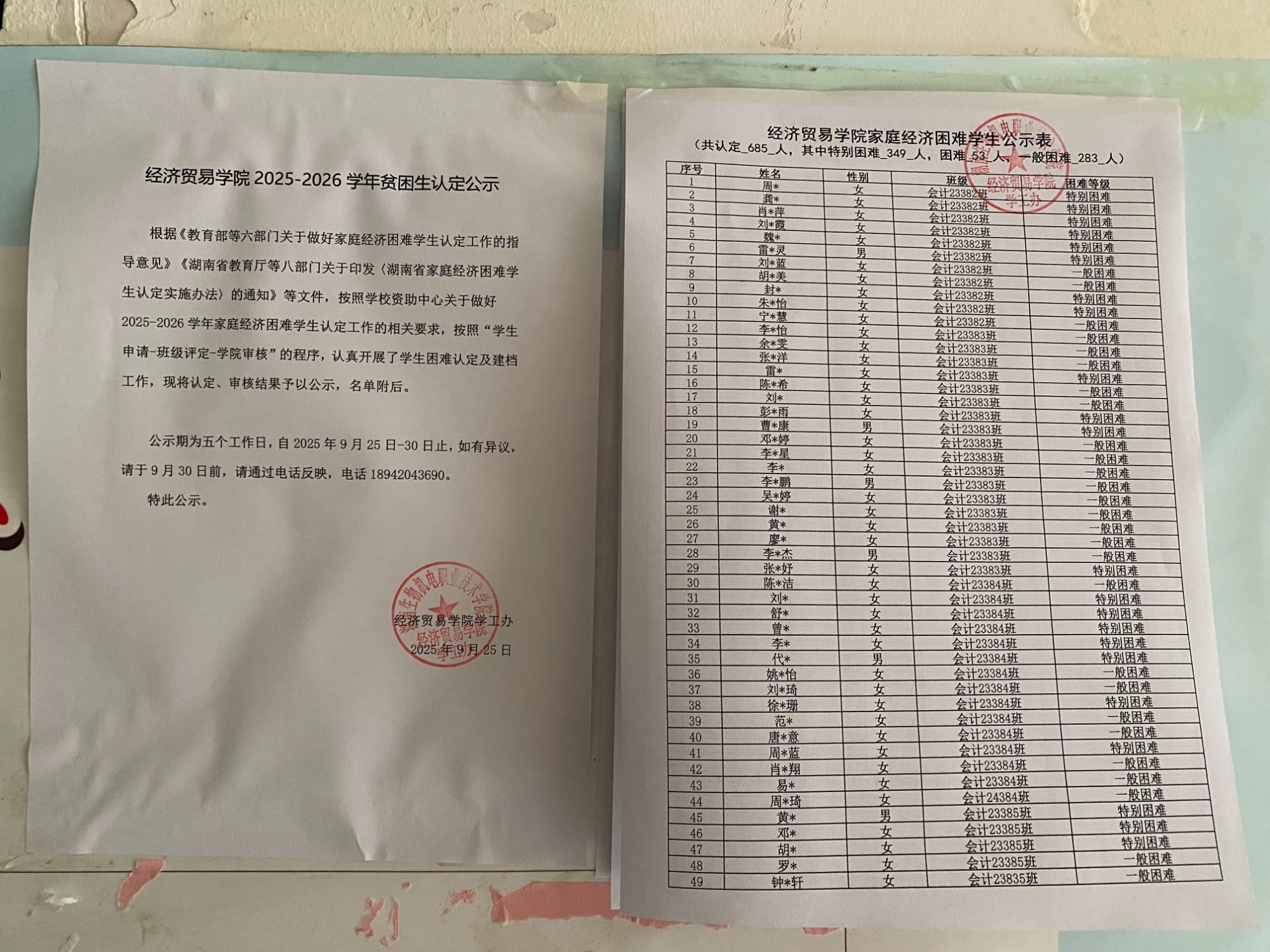 根据《教育部等六部门关于做好家庭经济困难学生认定工作的指导意见》《湖南省教育厅等八部门关于印发〈湖南省家庭经济困难学生认定实施办法〉的通知》等文件,按照学校资助中心关于做好2025-2026学年家庭经济困难学生认定工作的相关要求,按照"学生申请-班级评定-学院审核"的程序,认真开展了学生困难认定及建档工作,现将认定、审核结果予以公示,公示地点为知新楼二楼经济贸易学院公示栏处。