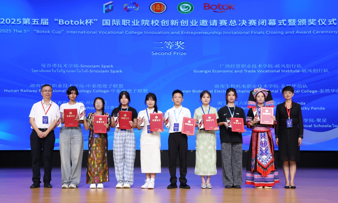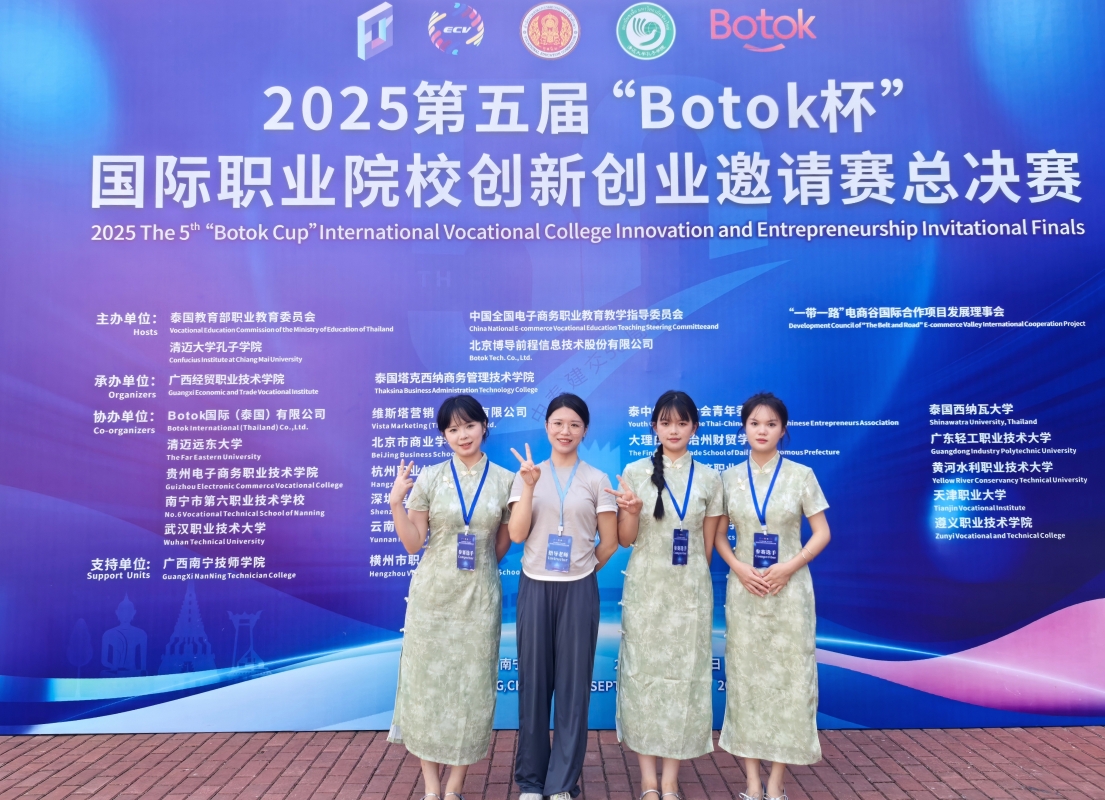 2025年9月27日,在广西经贸职业技术学院举行的第五届"Botok杯"国际职业院校创新创业邀请赛总决赛中,我校"泰然华韵"代表队从海内外众多优秀队伍中脱颖而出,荣获总决赛二等奖(总成绩第八名)。