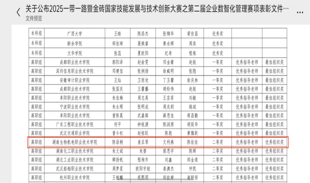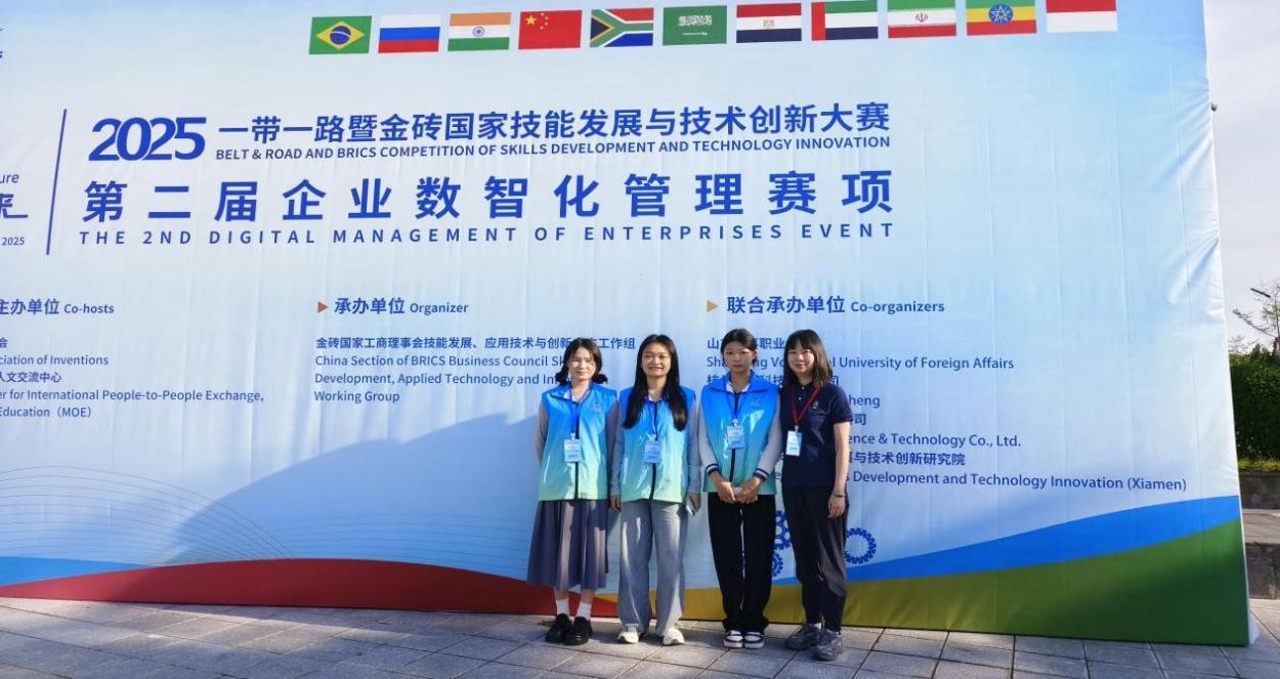 2025年9月21日,2025一带一路暨金砖国家技能发展与技术创新大赛第二届企业数智化管理赛项全国总决赛在山东外事职业大学成功举办。本次大赛由金砖国家工商理事会中方理事会、一带一路暨金砖国家技能发展国际联盟、教育部中外人才交流中心等单位联合主办,赛事吸引了来自全国20多个省市92所本科、高职、中职院校的118支参赛队,近500名师生参与。指导老师陈依依与姜亚琴、文利燕、陈语桐三名同学组成参赛队伍,凭借扎实的专业功底、出色的数智化管理能力与默契的团队协作,从全国众多高职组参赛队伍中脱颖而出,最终斩获全国二等奖。